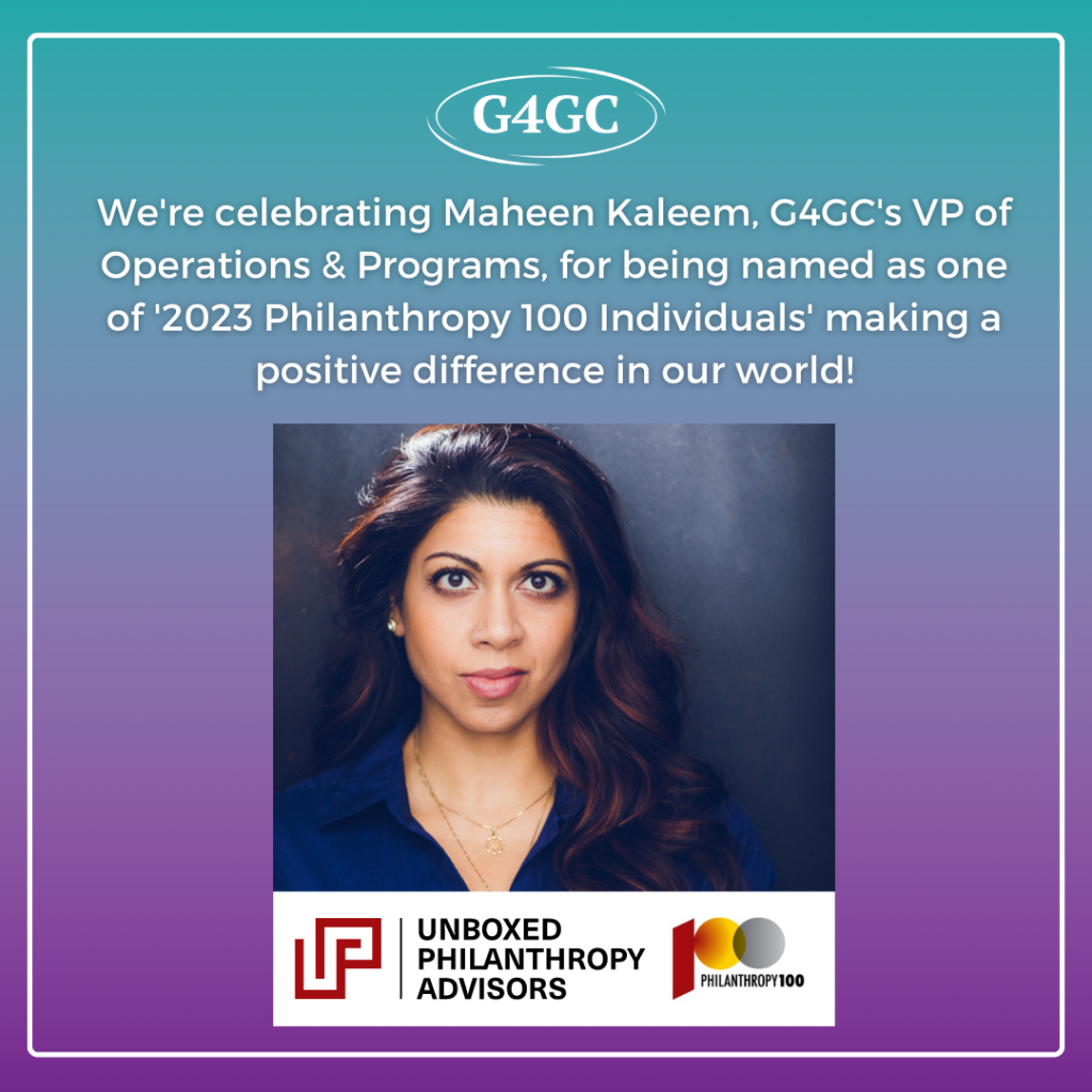 Maheen Kaleem, our G4GC Vice President of Operations and Programs, was selected as one of Unboxed Philanthropy Advisors’ Philanthropy 100 list of foundations, companies, and individuals making a positive difference in our world! 🎉
