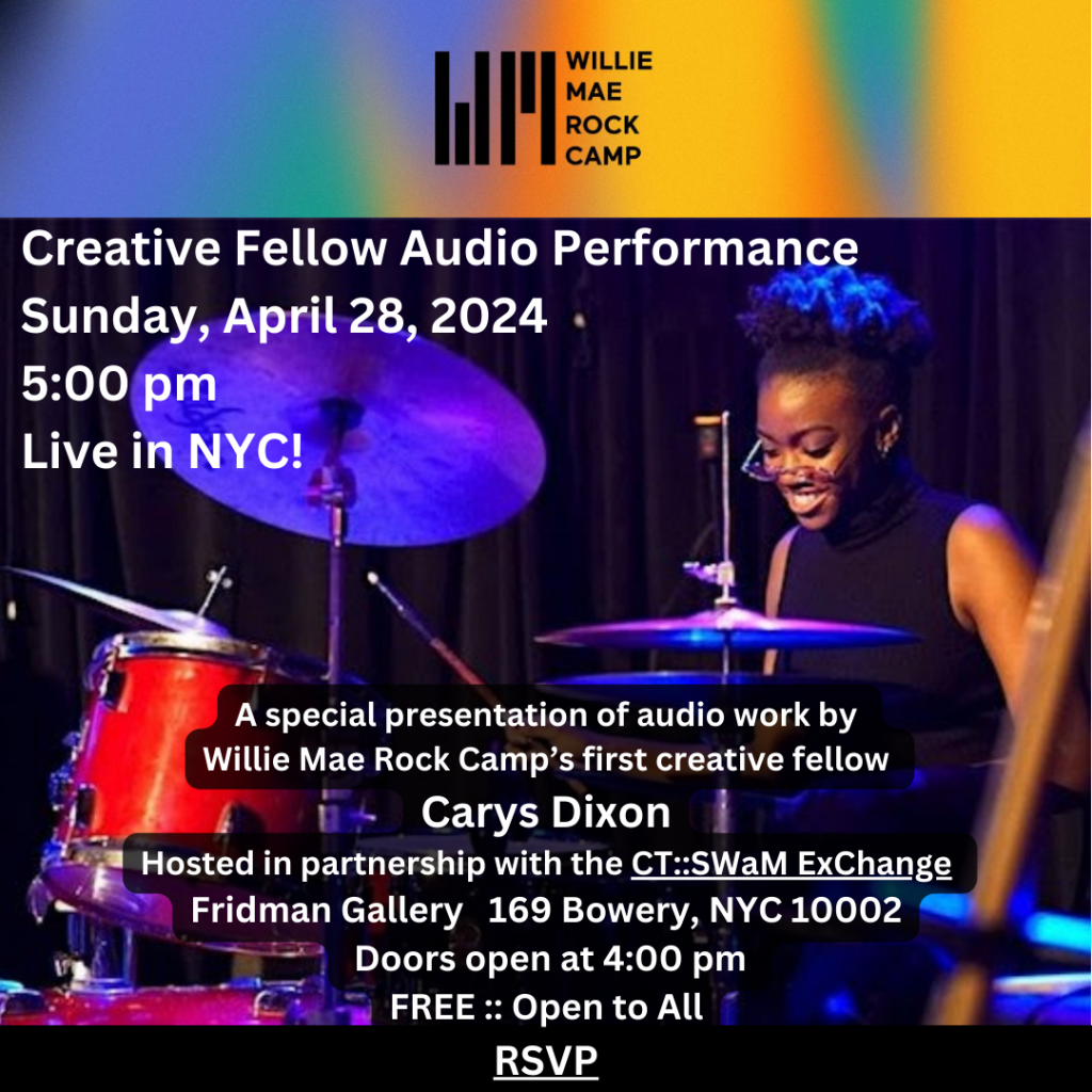 Carys Dixon, a Willie Mae Rock Camp alum and emerging artist, will debut a new, recorded work that combines her unique style. This free evening is hosted in partnership with the CT::SWaM ExChange, on Sunday, April 28th RSVP and details: Here!